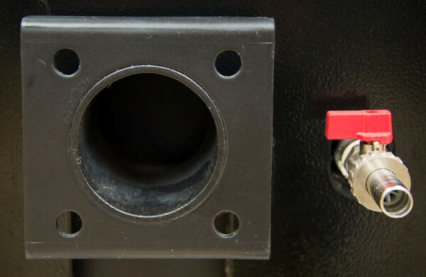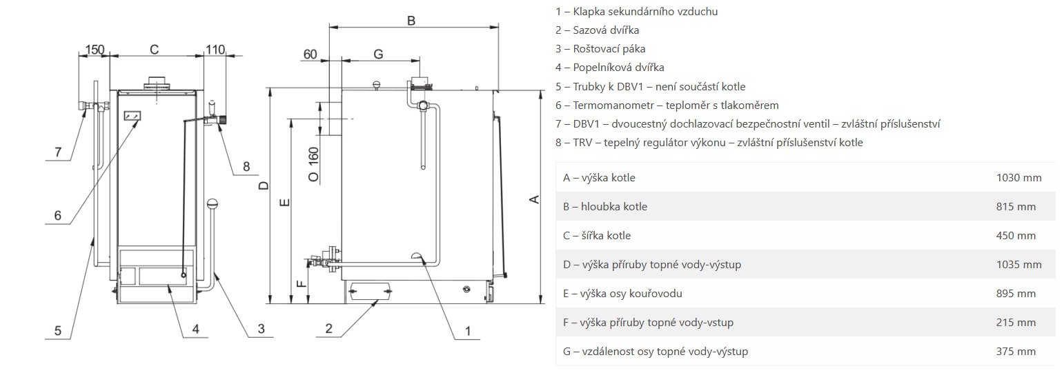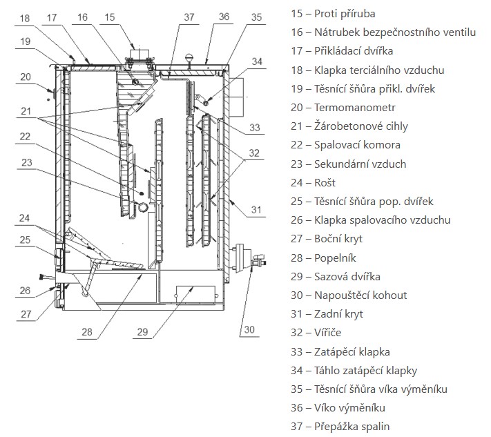 Regulace sekundárního vzduchu přiváděného do spalovací komory zvyšuje účinnost kotle. Primární vzduch přivádíme pod rošt regulovatelnou klapkou v popelníkových dvířkách. Regulace se provádí ručně nebo automatickým regulátorem, který je součástí ceny kotle. Na vstup a výstup topné vody používáme příruby DN 65. Kouřovod je vyveden v ose kotle na zadní straně. Zatápěcí klapka se ovládá z boku kotle. Sazové otvory pro čištění kotle jsou na kotli umístěny z obou stran.