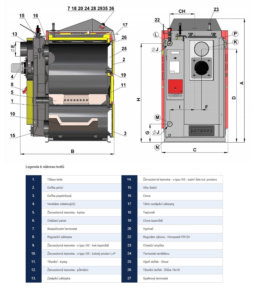 Těleso kotlů se vyrábí jako svařenec z kvalitních ocelových plechů o tloušťce 8 až 3 mm. Je tvořeno násypkou paliva (6 mm), která je ve spodní části kotle a je opatřena zplynovací tryskou s podélným otvorem pro průchod spalin a plynů. Dohořívací prostor pod násypkou je opatřen keramickými tvarovkami, které slouží pro úplné a vyhoření všech spalitelných látek s vysokou účinností při ekologicky šetrném spalování. V zadní části kotlů se nachází svislý spalinový kanál, který je opatřený ve vrchní části zatápěcí záklopkou. Vrchní část spalinového kanálu obsahuje odtahové hrdlo pro připojení na komín.